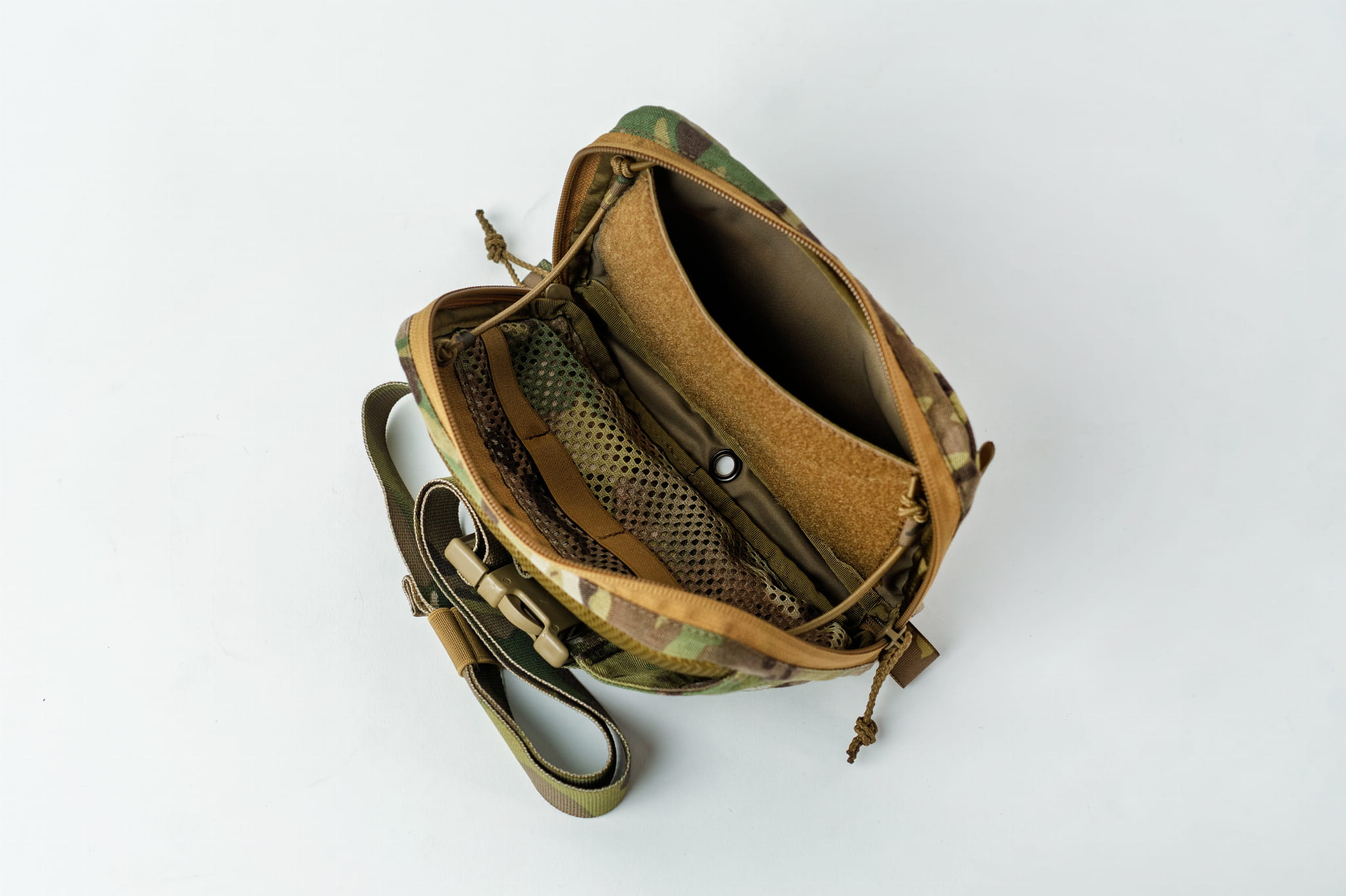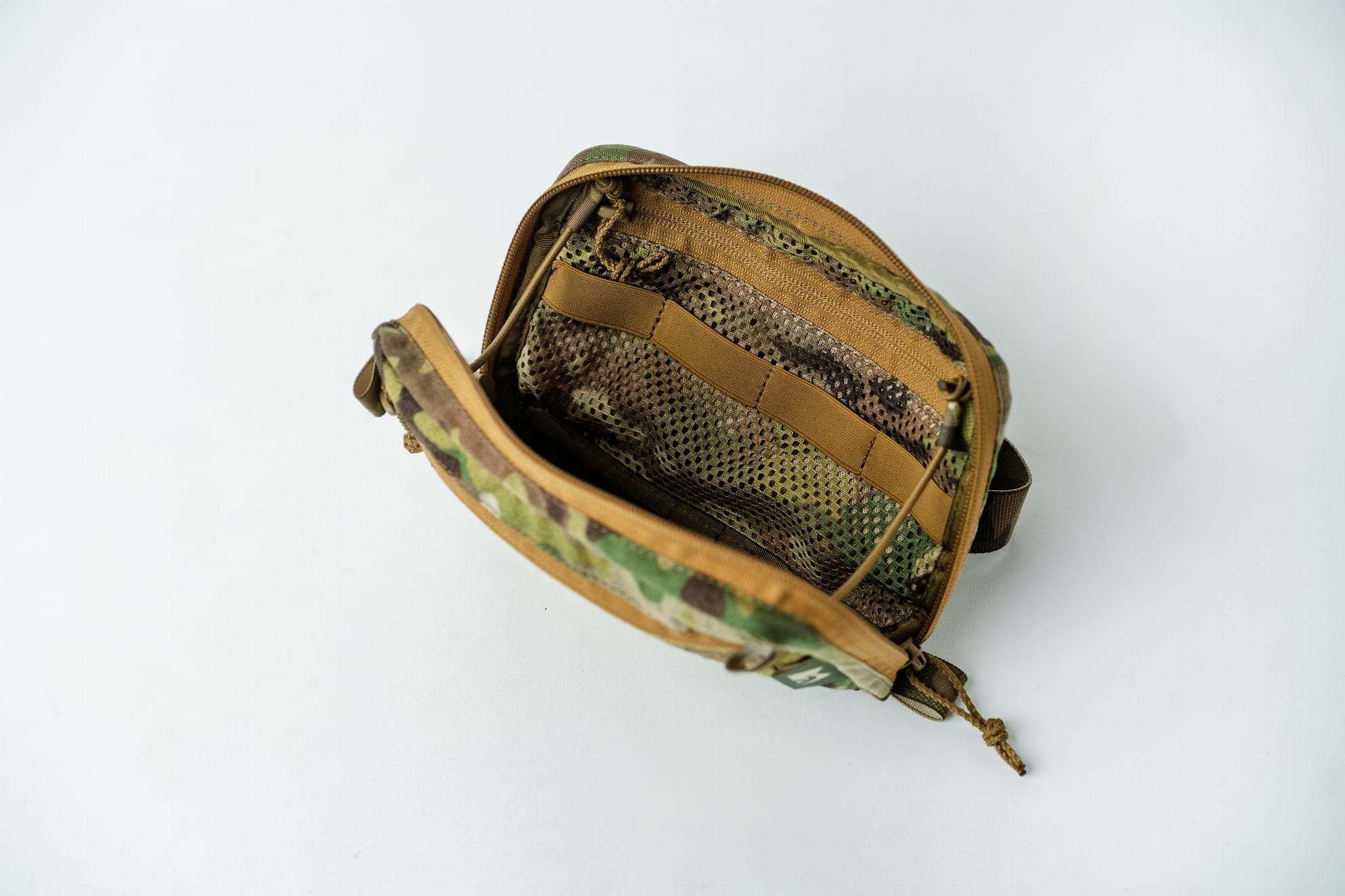 Wewnątrz jedna kieszeń z siatki, na niej naszyte przegrody z gumy elastycznej do segregacji podstawowego wyposażenia jak zapalniczka, multitool lub inne wyposażenie według uznania.